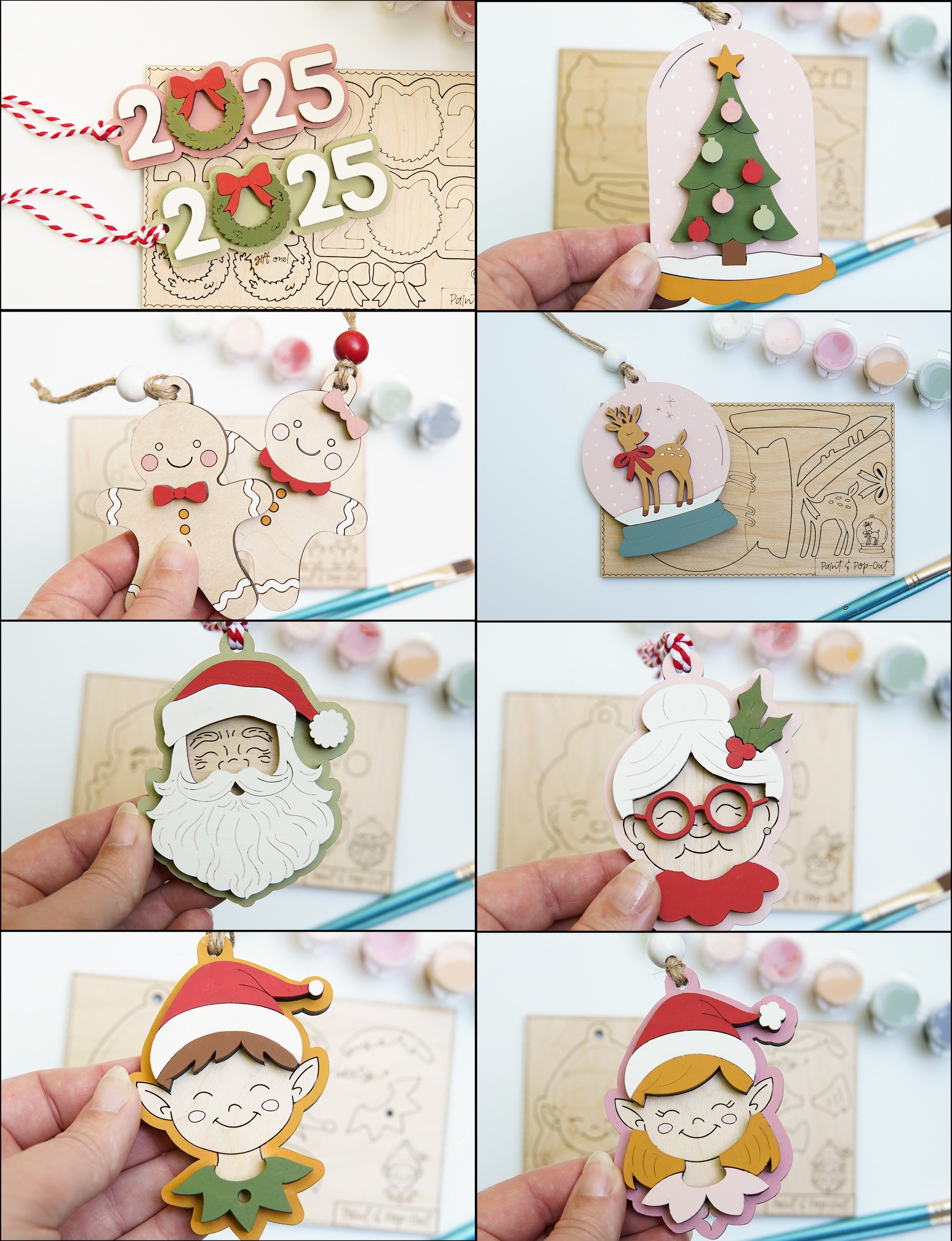 Paint kits come with wood pieces, paint brush, and assorted paint colors in Christmas shades