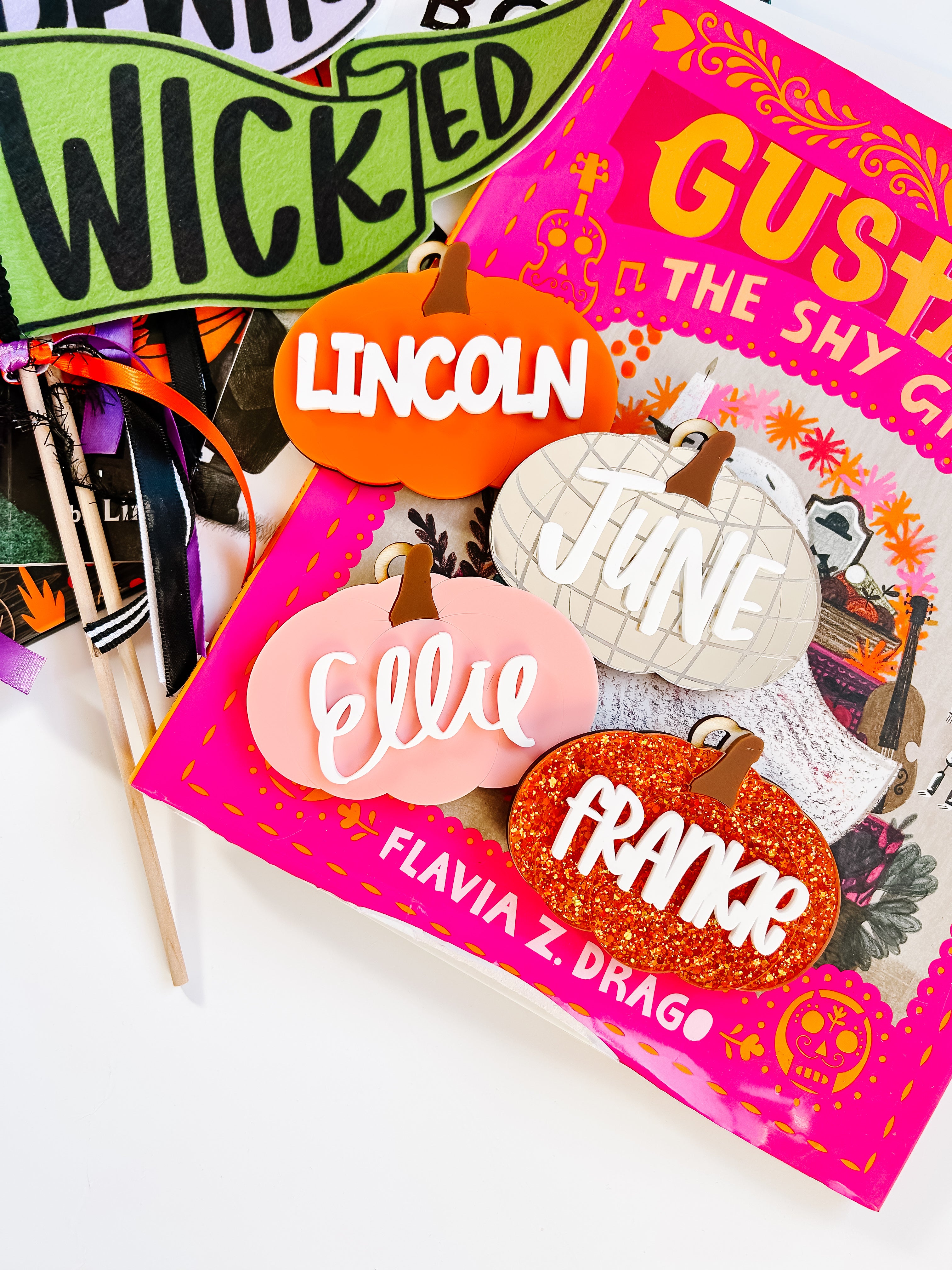 acrylic tags with acrylic laser cut letters attached. White string for hanging