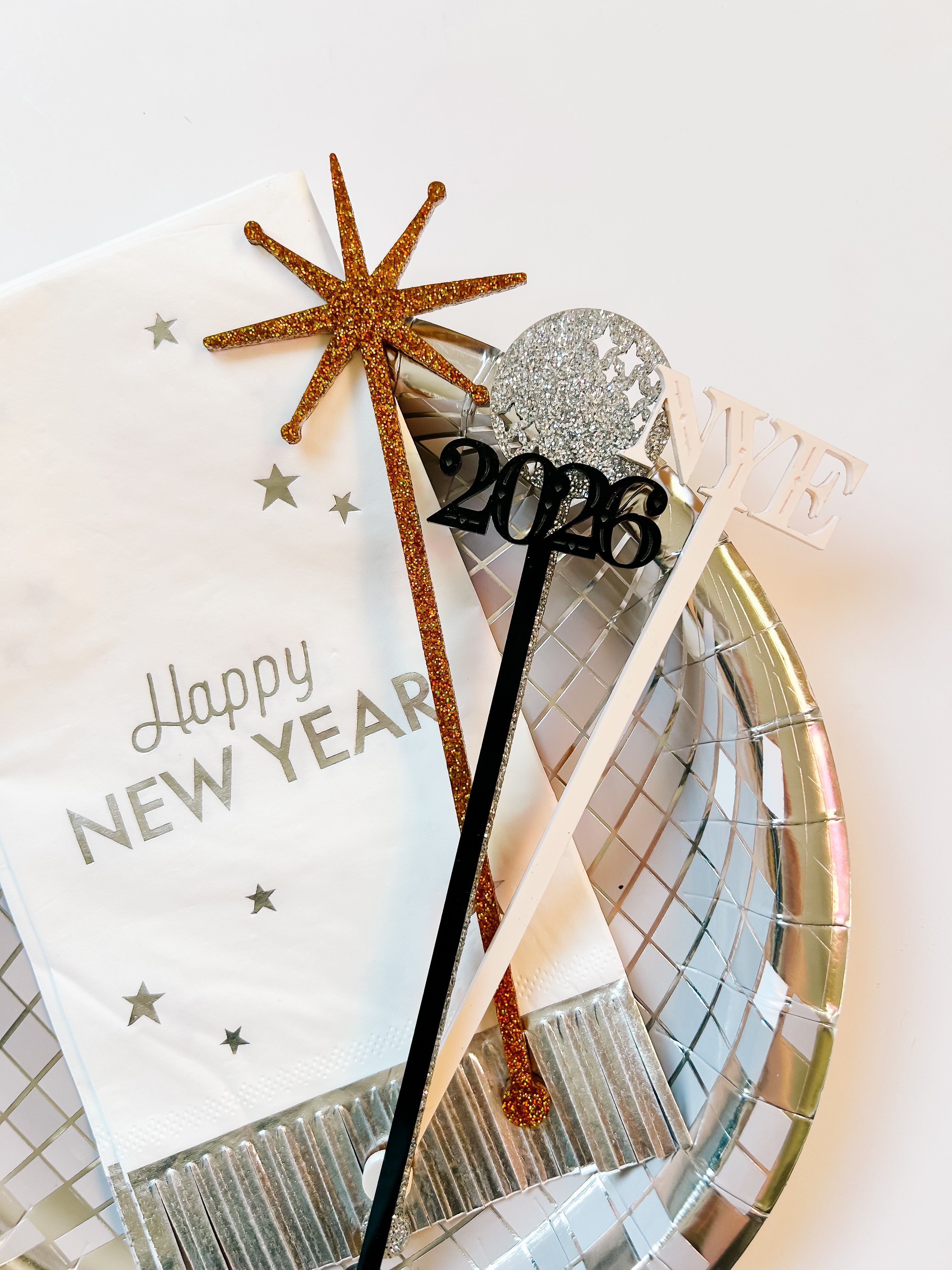 NYE style stir sticks in black, cream, and glitter gold and silver. Set of 4
