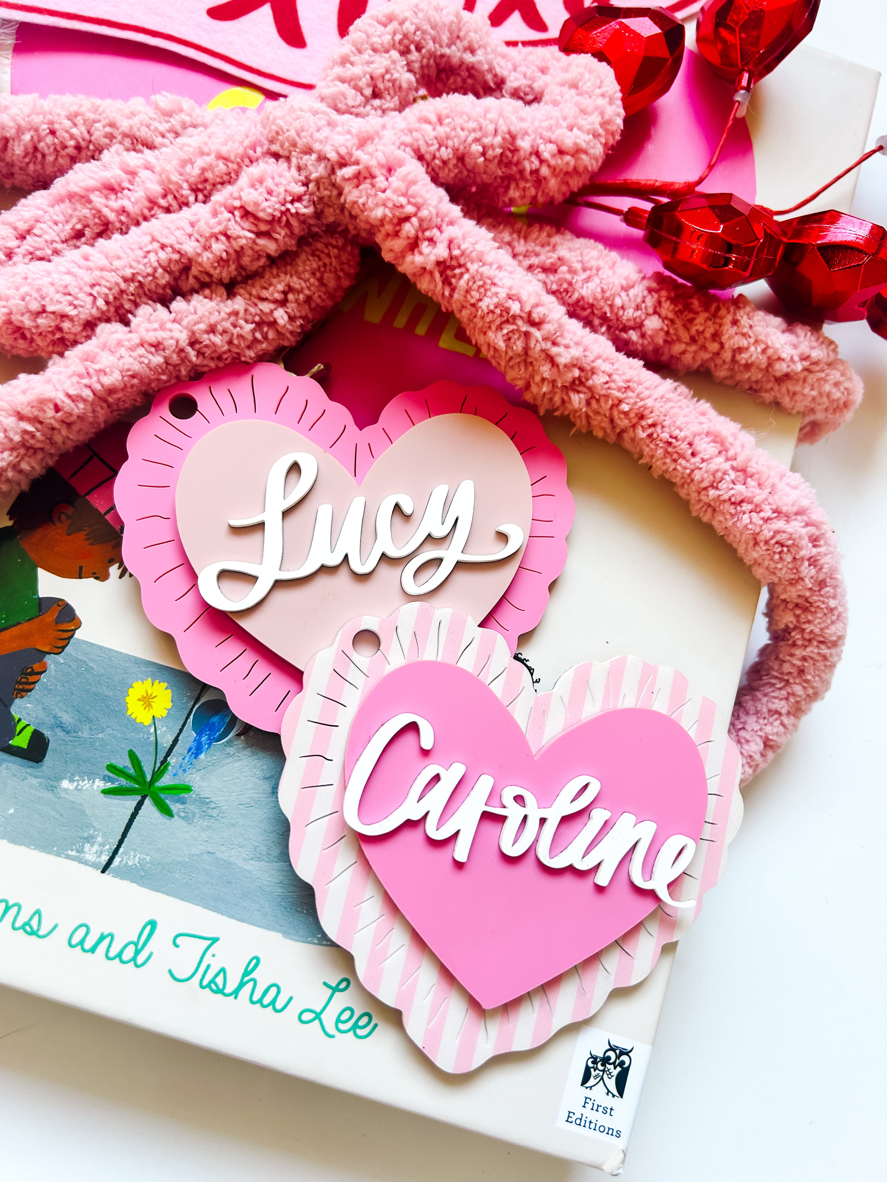 Acrylic name tag with shaker rainbow hearts inside. perfect for a love basket for Valentines day! Basic white yarn included for tying.