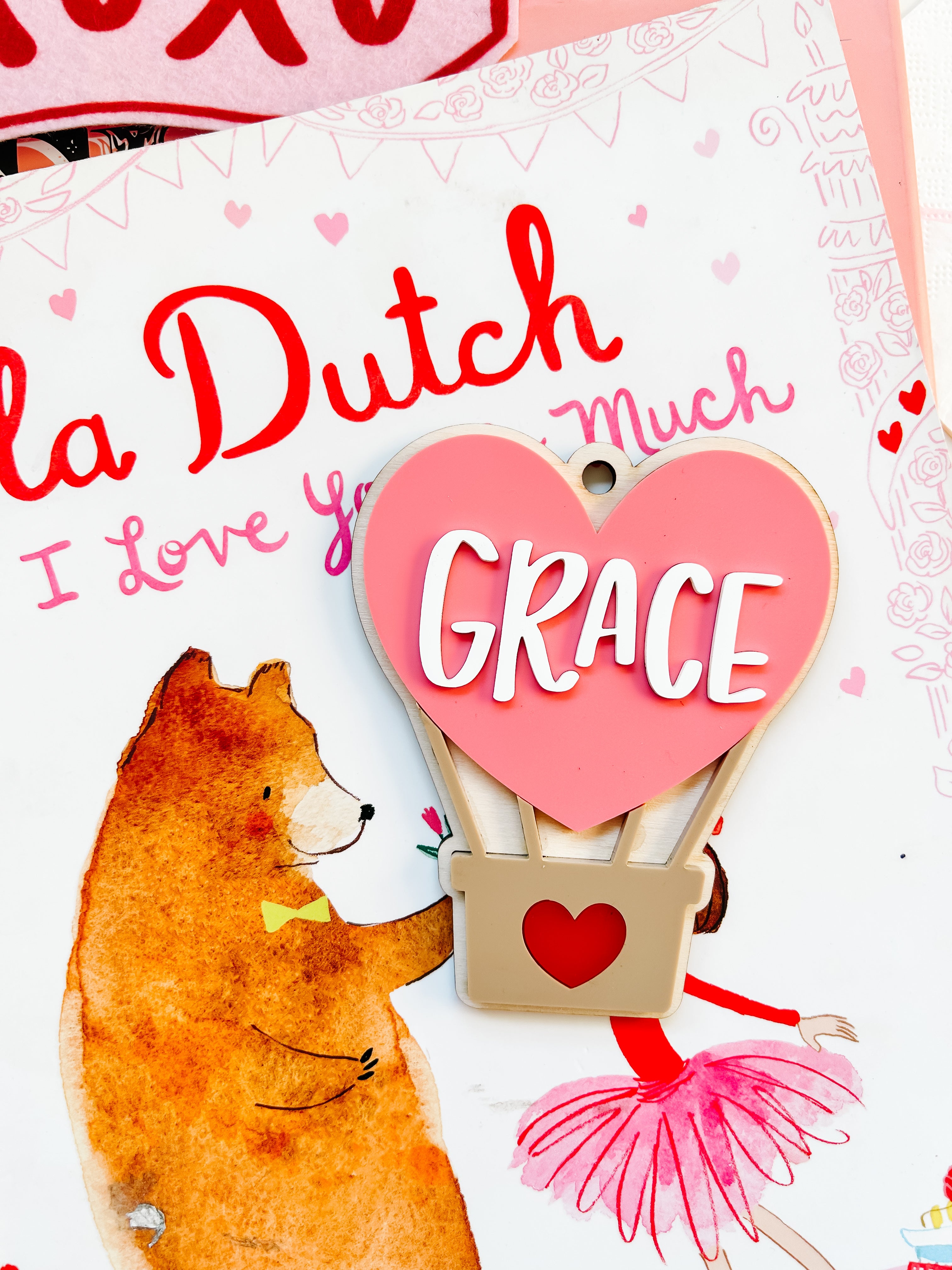 Acrylic name tag with shaker rainbow hearts inside. perfect for a love basket for Valentines day! Basic white yarn included for tying.