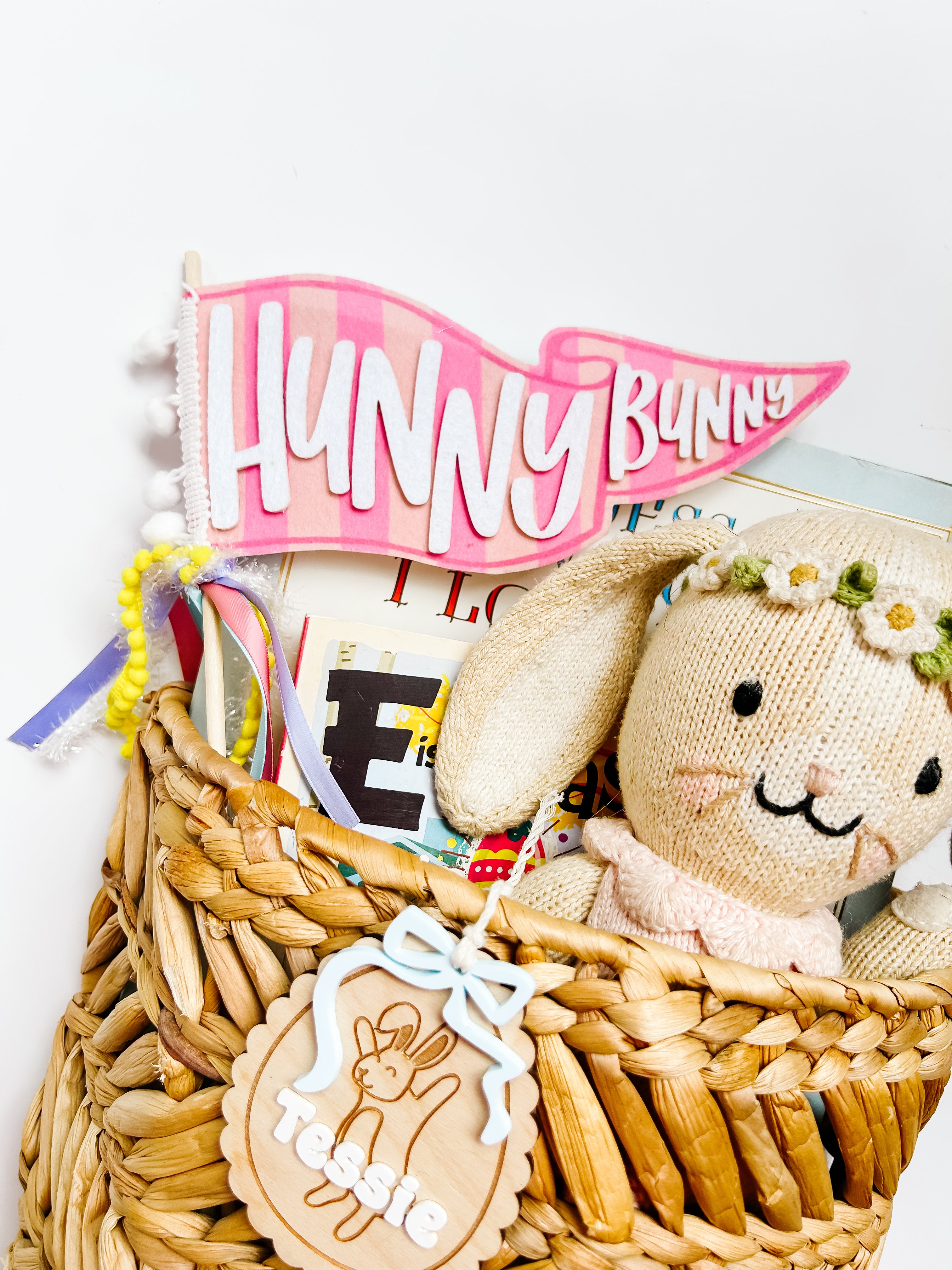 Felt pennant with attached wooden towel. Ribbons tied at end. Perfect addition for an Easter basket!
