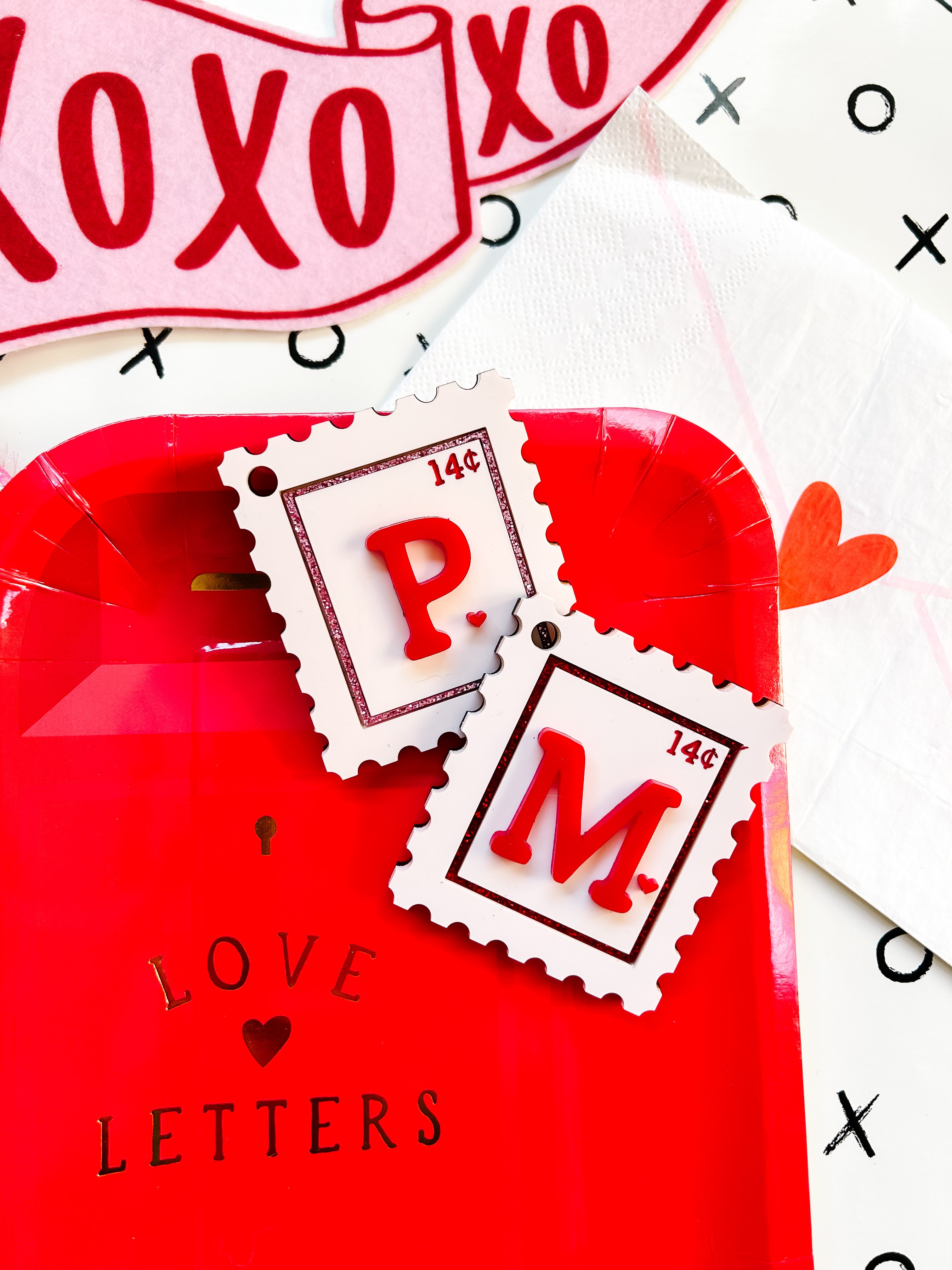 acrylic tag with initial, perfect for a love basket for Valentines day! Basic white yarn included for tying. Choice of glitter rectangle border