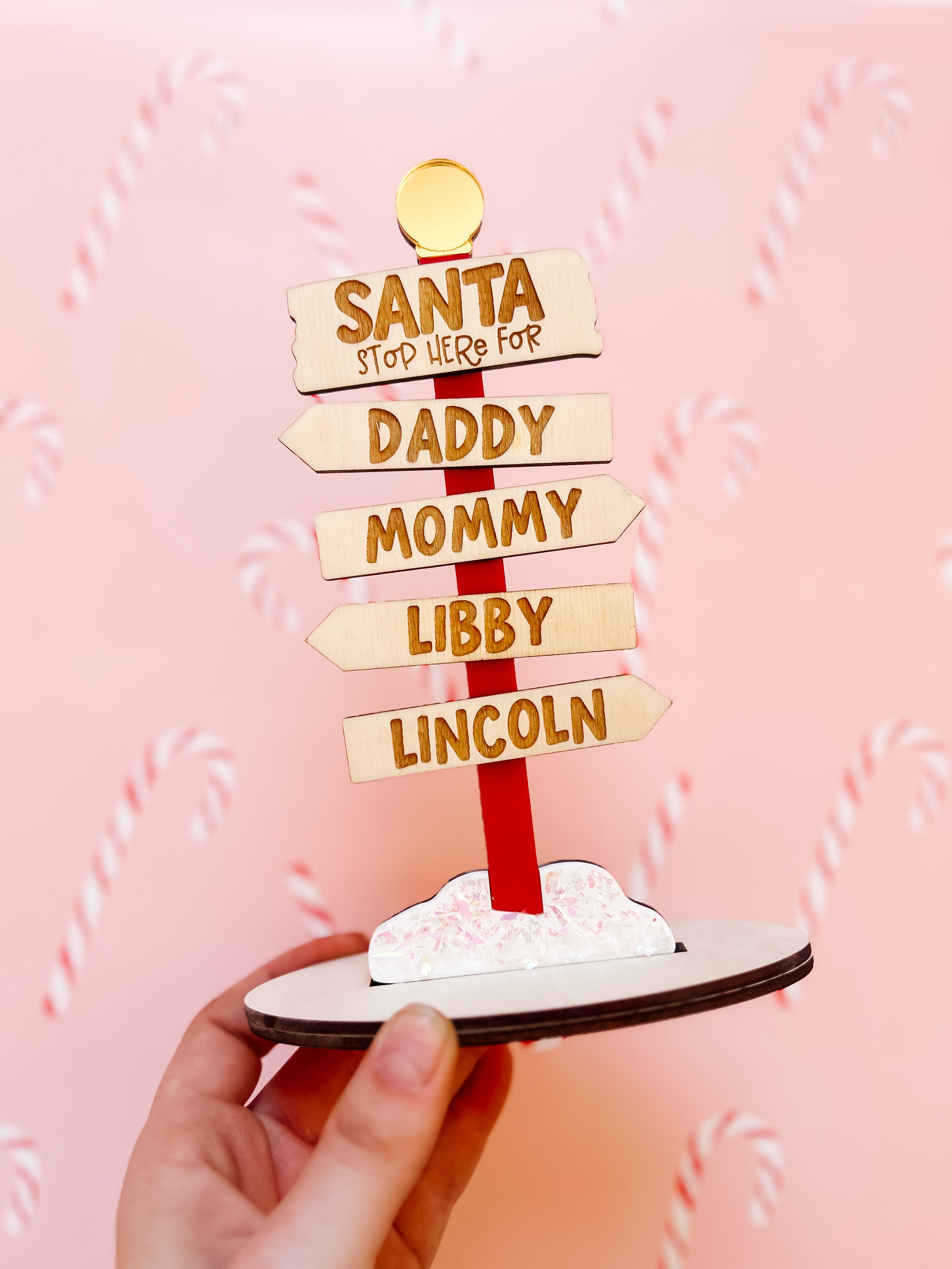 Santa Stop here for your family! Choice of standing sign for a shelf or an ornament for the tree! Standing sign is approximately 7" tall